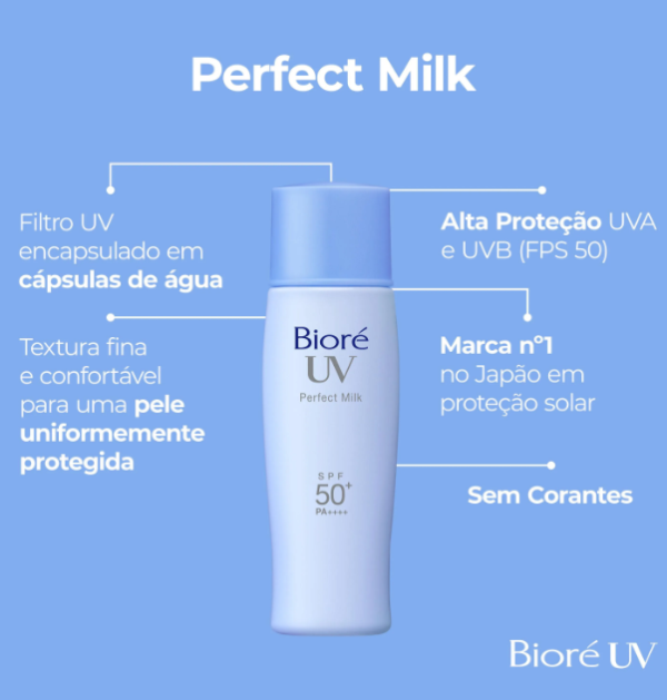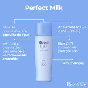 Bioré Perfect Milk é um protetor solar facial e corporal de alta proteção contra os raios UVB e UVA (FPS 50). Com emulsão leve, é fácil de espalhar e não deixa a pele oleosa ou com sensação pegajosa. Não possui corantes ou fragrância em sua composição.
