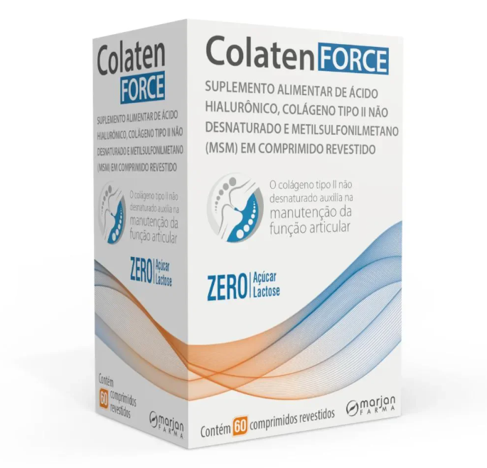 O Colaten Force é um suplemento alimentar em comprimidos, moderno e completo, que contém colágeno Tipo II não desnaturado, Ácido Hialurônico e Metilsulfonilmetano (MSM).